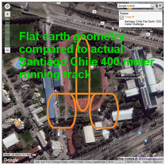 How 3 flat earth 400 m running tracks would layout over actual Santiago Chile Escuela PDI track